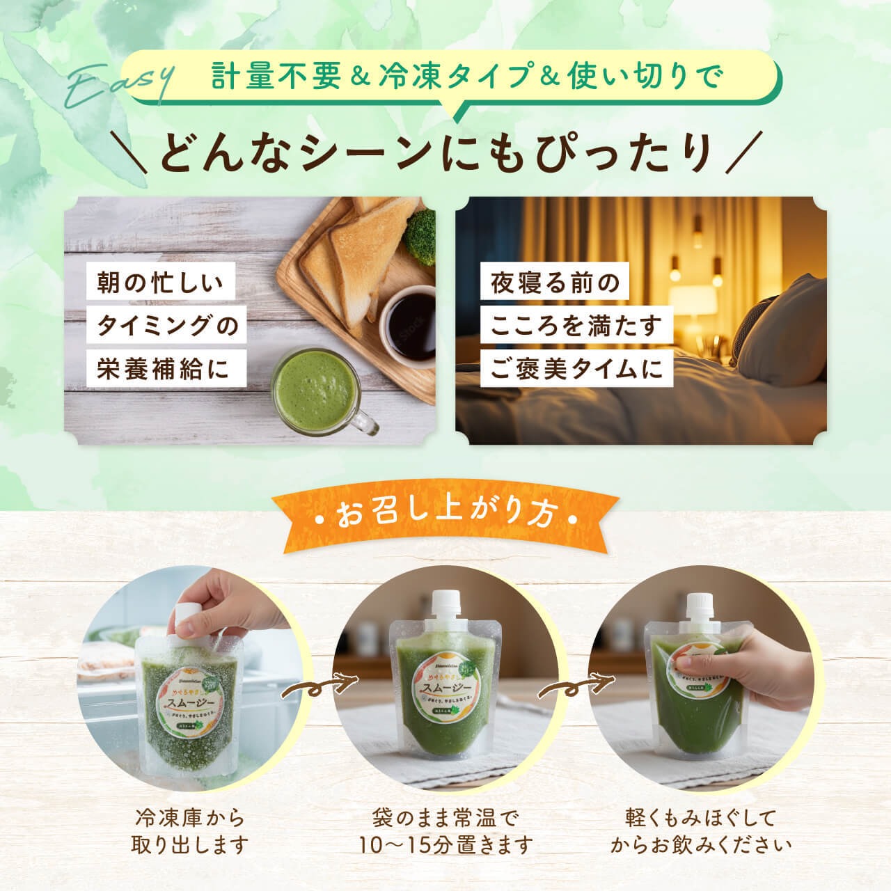 冷凍庫から取り出し、袋のまま常温で10〜15分置き、軽くもみほぐしてからお飲みください。