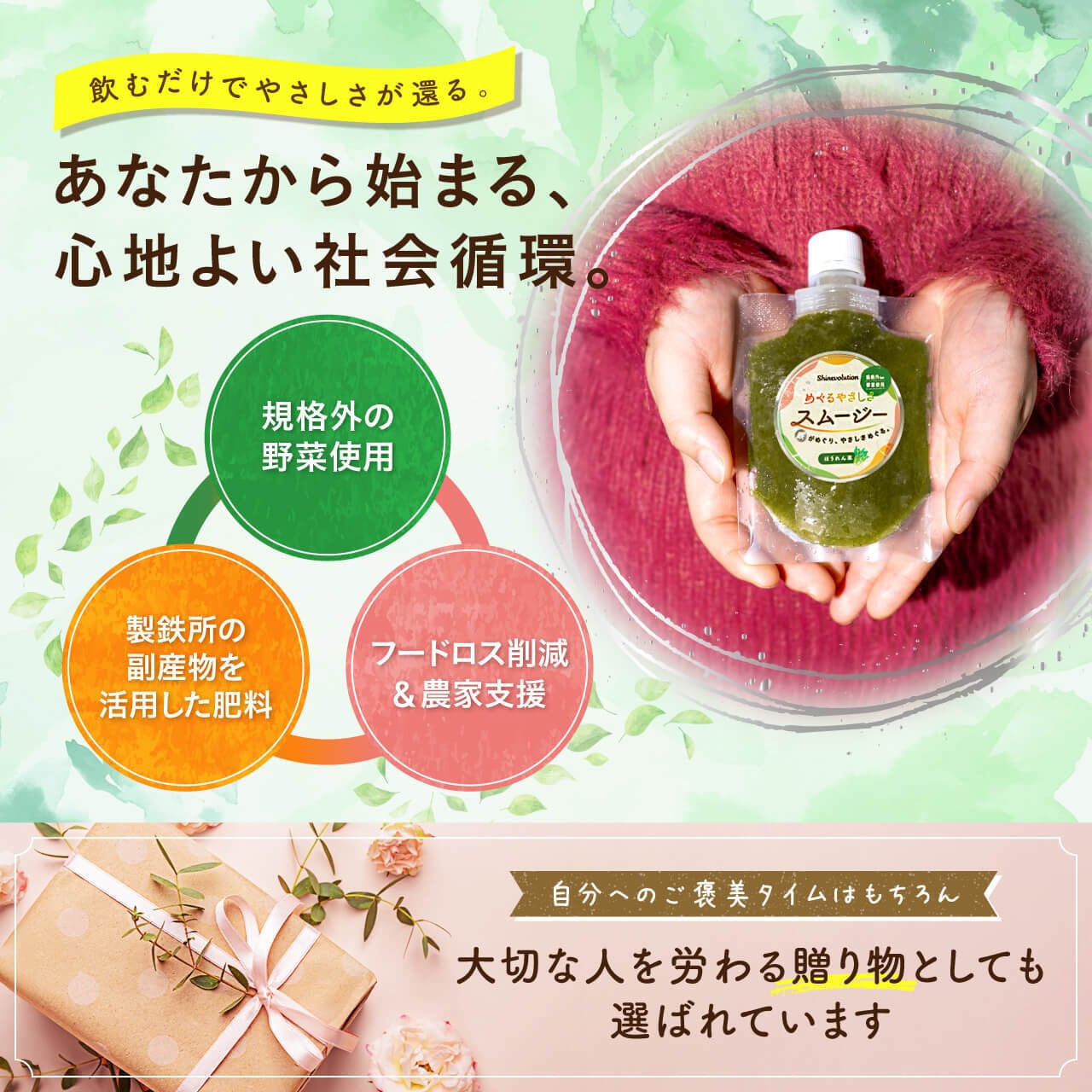 私自身"栄養と時間"に悩んでいたので、「忙しい毎日を健康に前向きに過ごせたら」という想いから、鉄鋼製造の副産物を活用した地球の養分(ミネラル等)を含む肥料(鉄鋼スラグ肥料)で育った規格外野菜を活用。環境と体に優しいスムージーを作りました。この挑戦を通じ、ものづくりの世界を身近に感じて頂けたら嬉しいです!